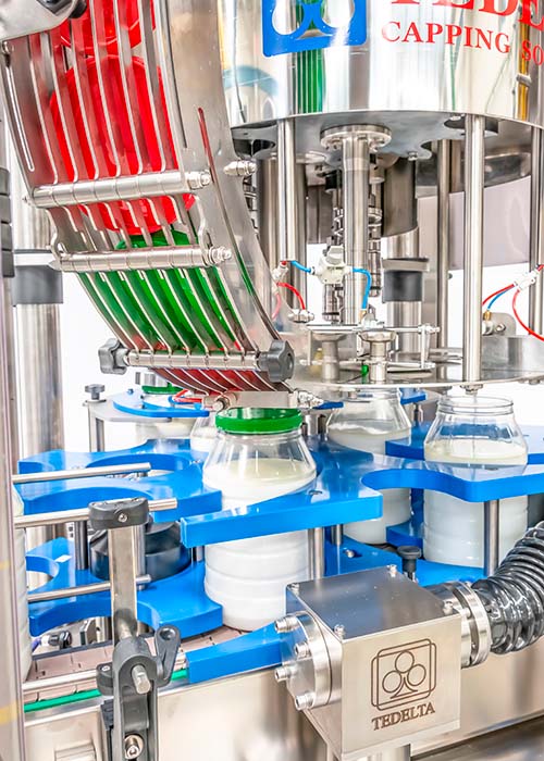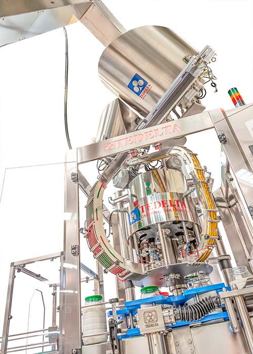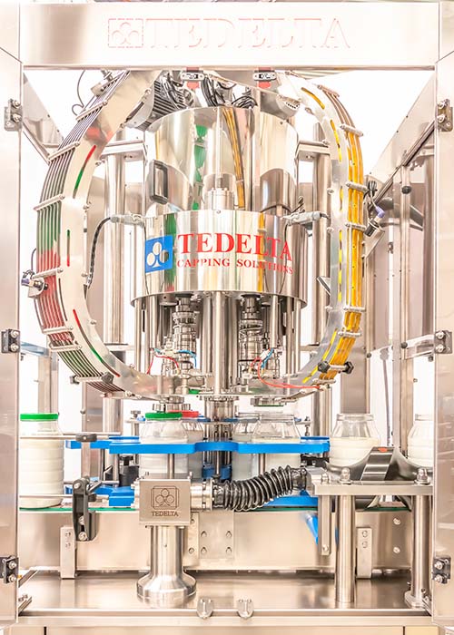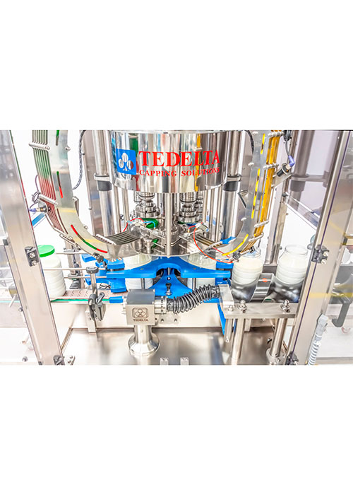 • Tedelta cappers process a wide range of plastic pre-threaded caps, flip-top caps, puh-on caps, sport caps, specialty caps, etc. on any bottle or jug, glass or PET..